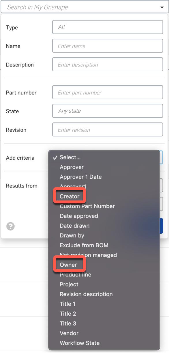 The search tool now has added criteria, you can now search Onshape by “Creator” and “Owner.”
